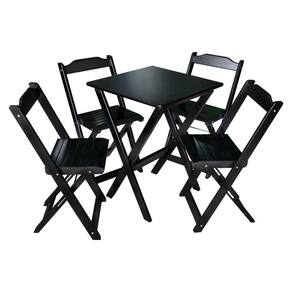 Jogo De Mesa 60x60 Com 4 Cadeiras Decor Tarimatã Para Area Gourmet - PretoÉ ideal para bares, restaurantes, estabelecimentos, áreas de lazer e também para sua casa. Em madeira tornando-os resistentes e duráveis. Seu design permite que esse conjunto seja encaixado em qualquer ambiente, trazendo um toque a mais para seu estabelecimento. Além de sua durabilidade, o que lhe trará conforto para servir seus clientes. Por ser dobrável torna-se mais fácil guardar, manusear e limpar o produto.Atenção: EVITE USAR PRODUTOS ABRASIVOS E QUÍMICOS PARA LIMPEZA DO PRODUTO, aconselha-se o uso de pano umedecido para melhor conservação; mantenha o produto fora de chuva e sol constantes.*imagens meramente ilustrativas*Medidas Mesa:Tampo 58x60 cmAltura 77cm Dimensões Cadeira:Altura da cadeira aberta 78cmAltura da cadeira fechada 89cmAltura até o assento 46cmLargura 41,5cmLargura vão do assento 37,5cmProfundidade 40cmProfundidade do assento 32cm