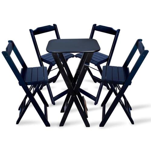 Jogo De Mesa Bistro Com 4 Cadeiras Dobravel Para Area De Lazer - Pretoé ideal para bares, restaurantes, estabelecimentos, áreas de lazer e tambem para sua casa. Em madeira maciça, tornando-os resistentes e duráveis. Seu design permite que esse conjunto seja encaixado em qualquer ambiente, trazendo um toque a mais para seu estabelecimento. Além de sua durabilidade, o que lhe trará conforto para servir seus clientes. Por ser dobrável torna-se mais fácil guardar, manusear e limpar o produto.Atenção: EVITE USAR PRODUTOS ABRASIVOS E QUÍMICOS PARA LIMPEZA DO PRODUTO, aconselha-se o uso de pano umedecido para melhor conservação mantenha o produto fora de chuva e sol constantes.*imagens meramente ilustrativas*ç Medidas Mesa Bistrô: Tampo 54cm x 45cm Altura 98cmç Dimensões Cadeira Bistrô: Altura da cadeira aberta 95cm Altura da cadeira fechada 105cm Altura até o assento 61cm Largura 41,5cm Largura vão do assento 37,5cm Profundidade 43cm Profundidade do assento 32cmJogo de Mesa Bistro com 4 Cadeiras Dobravel para Area de Lazer - Preto