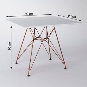 JOGO DE MESA EAMES DE FERRO COBRE E TAMPO QUADRADO BRANCO 90CM - 4 CADEIRAS BRANCASO Jogo de Mesa 4 Cadeiras Eames se destaca pelo design moderno e sofisticado. A Cadeira Eames É confeccionada em policarbonato, sua base É em ferro, o que confere total resistência e conforto, o tampo É confeccionado em MDF com pintura impermeÁvel garantindo melhor durabilidade ao produto, possuindo base em ferro. O Jogo de Mesa 4 Cadeiras Eames da vida ao ambiente alÉm de combinar com todos os tipos e cores de mÓveis.Dimensões:Cadeira:Cor: Branco (base ferro cobre) Altura: 85 cm Largura: 47 cm Profundidade: 50 cm Assento x Ch ão: 45 cm ContÉm: 04 cadeiras Peso mÁximo suportado: 120 KgMesa:Cor: Branco (base ferro cobre) Altura: 80 cmLargura: 90 cm Profundidade: 90 cmObs: Imagens Meramente IlustrativaJogo de Mesa Eames de Ferro Cobre e Tampo Quadrado Branco 90cm - 4 Cadeiras Brancas