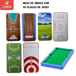 Jogo de Mesa de sinuca 7 em 1 com Pé CBS1085 - Castela DESCRIÇÃO DO PRODUTO Diversão garantida com a Mesa 7 em 1 com pés Um brinquedo completo que reúne sete jogos em um único produto: sinuca, boliche, hóquei, futebol, basquete, golfe e ice hockey. Acompanha todos os acessórios necessários para cada jogo e é ideal para estimular a coordenação motora, raciocínio e socialização das crianças. Produto versátil e prático, com estrutura estável e design colorido, perfeito para diferentes idades.
