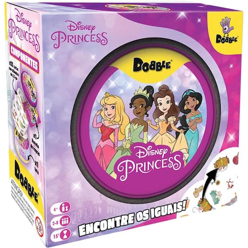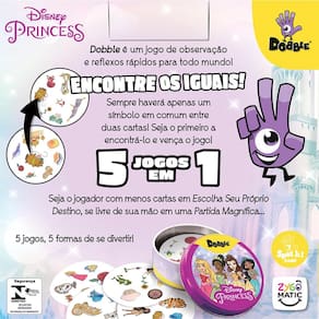 Jogo De Mesa Dobble - Spot It Princesas DisneyDobble é um jogo de sucesso mundial, um verdadeiro desafio de velocidade e observação no qual todos jogam ao mesmo tempo. O objetivo é identificar qual é o símbolo em comum entre duas cartas - e cada carta tem somente um símbolo em comum com qualquer outra carta do baralho. Todos os participantes têm a mesma chance de vencer a rodada, sendo necessário ser ágil.Dobble é composto de 30 a 55 cartas com 8 símbolos por carta.Como Jogar?Existem 5 modos de jogar, com regras simples que podem ser ensinadas em 1 minuto! Cada partida de Dobble tem menos de 15 minutos de duração. Os jogadores vão querer testar todos os modos de jogos várias vezes.O objetivo é sempre identificar o elemento igual entre duas cartas primeiro. Mas dependendo do modo de jogo você poderá se livrar de suas cartas, entregar cartas para os seus oponentes ou até roubar cartas deles, o que torna Dobble sempre variado.Um jogo frenético com uma competição divertida, que pode ser jogado entre pessoas com diferentes idades - jogue em família ou com amigos, a diversão é garantida.A embalagem de metal trabalhada em relevo facilita o transporte e a preservação das cartas. Seu formato compacto permite que ele possa ser jogado em quase qualquer lugar: em uma festa para quebrar o gelo, entre sessões mais longas de jogos ou mesmo em uma maratona de mini-games - Dobble é para todo momento!Lista de componentes- 30 a 55 Cartas (alguns modelos têm diferentes quantidades de cartas)- 1 Folheto de regras- 1 LataIdade Recomendada: 6+ anosNúmero de Participantes: 2 a 8Tempo de Partida: 15 minutos