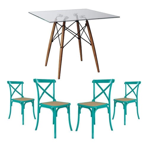 Jogo De Mesa Eiffel Quadrado Tampo De Vidro 110cm Com 4 Cadeiras Katrina aço c/ Azul Turquesa Assento BegeA sua cozinha ou sala de jantar ficará completa com esse lindo Conjunto de Mesa e Cadeiras! Contendo um design de móveis moderno, elegante e com uma ousada combinação de cores, esse é um kit que certamente é uma solução que esbanja estilo, elegância e muito requinte.O conjunto tem em sua diversificada estrutura de materiais com altíssima qualidade, que proporciona muito mais resistência, mesmo com o passar dos anos, e com seus 4 assentos Katrina Aço é ideal para um jantar em família sem abrir mão do conforto. O Kit acompanha versatilidade e combina com vários tipos de decoração, o que dá mais praticidade em sua casa.Informações técnicas Conjunto:Conteúdo da Embalagem: 01 Mesa e 04 Cadeiras (Embalados Separadamente).Instruções/Cuidados: Limpar com pano seco ou levemente umedecido com água.Necessita de Montagem? Sim.Mesa:Modelo: Eiffel WoodTipo: QuadradaCor do tampo: VidroCor da base dos pés: Wood (Madeira)Material do tampo: Vidro TemperadoMaterial dos pés: MadeiraDimensões: Altura: 76 cm // Largura: 110 cm // Profundidade: 110 cmCadeiras:Modelo: KatrinaCor: Azul Turquesa e BegeMaterial da estrutura: Aço com Pintura E-PoxMaterial do assento: Espuma D14 com Revestimento em Corano.Dimensões: Altura: 90 cm // Largura: 50 cm // Profundidade: 55 cmJogo de Mesa Eiffel Quadrado Tampo de Vidro 110cm com 4 Cadeiras Katrina Azul Turquesa Assento Bege