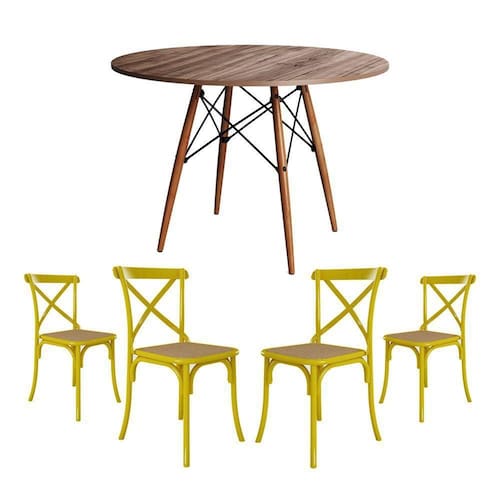 Jogo De Mesa Eiffel Redondo Tampo De Madeira 110cm Amêndoa Com 4 Cadeiras Katrina Amarela Assento Be