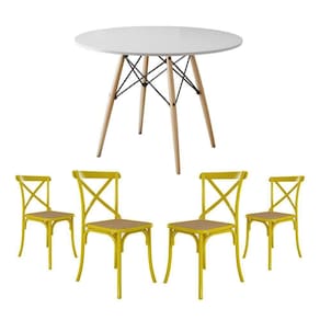 Jogo De Mesa Eiffel Redondo Tampo De Madeira 110Cm Branco Com 4 Cadeiras Katrina Amarelao Beg