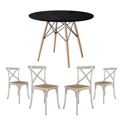 Jogo De Mesa Eiffel Redondo Tampo De Madeira 110cm Preto Com 4 Cadeiras Katrina Branca Assento Bege