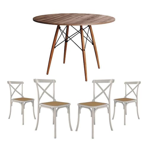 Jogo De Mesa Eiffel Redondo Tampo De Madeira 90cm Amêndoa Com 4 Cadeiras Katrina Aço Branca Assento BegeA sua cozinha ou sala de jantar ficará completa com esse lindo Conjunto de Mesa e Cadeiras! Contendo um design de móveis moderno, elegante e com uma ousada combinação de cores, esse é um kit que certamente é uma solução que esbanja estilo, elegância e muito requinte.O conjunto tem em sua diversificada estrutura de materiais com altíssima qualidade, que proporciona muito mais resistência, mesmo com o passar dos anos, e com seus 4 assentos Katrina Aço é ideal para um jantar em família sem abrir mão do conforto. O Kit acompanha versatilidade e combina com vários tipos de decoração, o que dá mais praticidade em sua casa.Informações técnicas Conjunto:Conteúdo da Embalagem: 01 Mesa e 04 Cadeiras (Embalados Separadamente).Instruções/Cuidados: Limpar com pano seco ou levemente umedecido com água.Necessita de Montagem? Sim.Mesa:Modelo: Eiffel WoodTipo: RedondaCor do tampo: AmêndoaCor da base dos pés: Wood (Madeira)Material do tampo: MadeiraMaterial dos pés: MadeiraDimensões: Altura: 76 cm // Largura: 90 cm // Profundidade: 90 cmCadeiras:Modelo: KatrinaCor: Branca e BegeMaterial da estrutura: Aço com Pintura E-PoxMaterial do assento: Espuma D14 com Revestimento em Corano.Dimensões: Altura: 90 cm // Largura: 50 cm // Profundidade: 55 cmJogo de Mesa Eiffel Redondo Tampo de Madeira 90cm AmÃndoa com 4 Cadeiras Katrina Branca Assento Bege