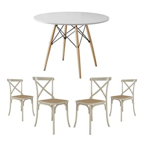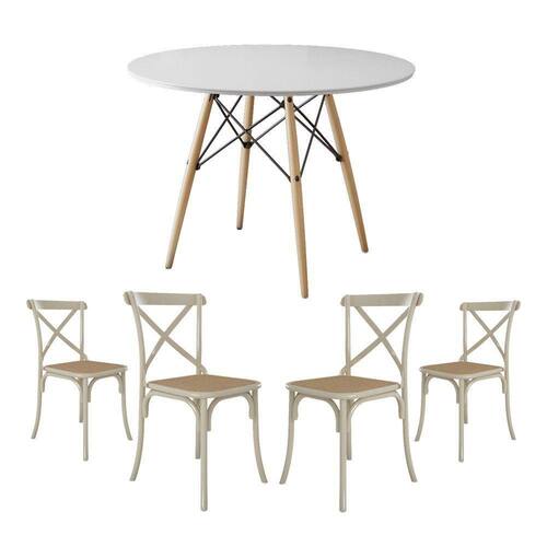 Jogo De Mesa Eiffel Redondo Tampo De Madeira 90cm Branco Com 4 Cadeiras Katrina Off White Assento Be