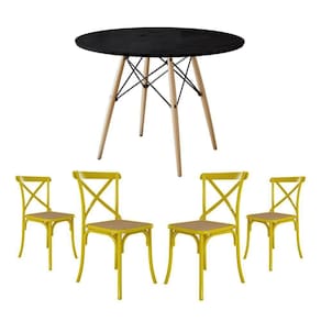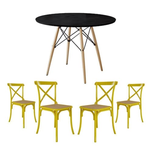 Jogo De Mesa Eiffel Redondo Tampo De Madeira 90Cm Preto Com 4 Cadeiras Katrina Amarela Assento Bege
