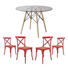 Jogo De Mesa Eiffel Redondo Tampo De Vidro 110cm Com 4 Cadeiras Katrina Vermelha Assento Bege