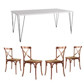 Jogo De Mesa Elen Retangular Tampo De Madeira 140x80cm Branco Com 4 Cadeiras Katrina Cobre Assento RA sua cozinha ou sala de jantar ficará completa com esse lindo Conjunto de Mesa e Cadeiras! Contendo um design de móveis moderno, elegante e com uma ousada combinação de cores, esse é um kit que certamente é uma solução que esbanja estilo, elegância e muito requinte.O conjunto tem em sua diversificada estrutura de materiais com altíssima qualidade, que proporciona muito mais resistência, mesmo com o passar dos anos, e com seus 4 assentos Katrina em Aço Cobre é ideal para um jantar em família sem abrir mão do conforto. O Kit acompanha versatilidade e combina com vários tipos de decoração, o que dá mais praticidade em sua casa sem abrir mão de um espaço a mais na mesa.Informações técnicas Conjunto:Conteúdo da Embalagem: 01 Mesa e 04 Cadeiras (Embalados Separadamente).Instruções/Cuidados: Limpar com pano seco ou levemente umedecido com água.Necessita de Montagem? Sim.Mesa:Modelo: ElenTipo: RetangularCor do tampo: Branco Cor da base dos pés: PretoMaterial do tampo: Madeira Dimensões: Altura: 76 cm // Largura: 140 cm // Profundidade: 80 cmCadeiras:Modelo: KatrinaCor: Cobre e BegeMaterial da estrutura: Aço CobreMaterial do assento: Espuma D14 com Revestimento em Corano.Dimensões: Altura: 90 cm // Largura: 50 cm // Profundidade: 55 cmJogo de Mesa Elen Retangular Tampo de Madeira 140x80cm Branco com 4 Cadeiras Katrina Cobre Assento R