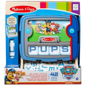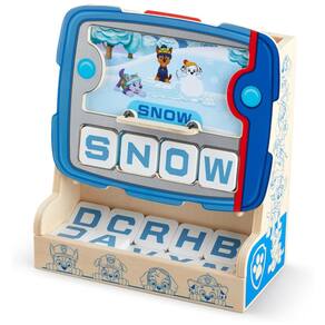 Aprenda letras e pratique a ortografia com este jogo inspirado na Patrulha Canina O produto inclui 26 blocos de letras de dupla face e 15 cartões ortográficos de dupla face. Para jogar, basta deslizar um dos cartões no Pup Pad de madeira e usar os blocos de letras para soletrar a palavra indicada na cena. Após soletrar, levante a aba do Pup Pad para verificar a resposta. As peças são armazenadas na bandeja de armazenamento na base do jogo.