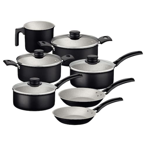 Características Principais: Marca: Tramontina Modelo: Turim Material da Panela: Alumínio Material da Tampa: Vidro e Aço Inox Revestimento: Starflon Antiaderente Quantidade de Pecas: 7 Cor: Preto EAN: 17891112332963