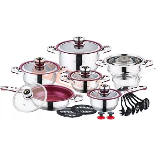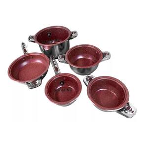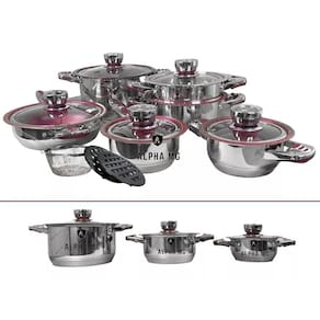 Jogo de Panela vermelha Antiaderente/Fogão Indução Jogo com 23 peças. Fabricação alemã com certificado de mundial. As peças são em aço cirúrgico com tampa de vidro temperado, fundo em 9 camadas com revestimento cerâmico e antiaderente. Todas as tampas são equipadas com termômetro / termostato. Aço inoxidável 18/10. Relação das peças: 1 Caçarola 6,5 litros medindo 24cmX14cm com tampa de vidro temperado 1 Caçarola 3,0 litros medindo 20cmX10cm com tampa de vidro temperado 1 Caçarola 1,6 litros medindo 16cmX8cm com tampa de vidro temperado 1 Frigideira 3,05 litros medindo 24cmX6,5cm com tampa de vidro temperado 1 Panela 1,6 litros medindo 16cmX9cm com tampa de vidro temperado 1 Panela vaporizadora medindo 20cmX10cm sem tampa 1 Fritadeira medindo 18cm 1 Bacia para misturas medindo 20cmX6cm com tampa plástica 2 Suporte de panelas em bakelite 1 Conjunto de utensílios de cozinha com 6 peças em nylon 1 Botão de sucção Peso aproximado do conjunto é de 11,5Kgs. Marca: Não Informado