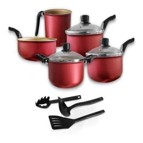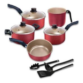 Esse conjunto é composto por 05 peças e 03 utensílios, o que diminui o tempo que você precisa ficar à frente do fogão, além de garantir um cozimento uniforme dos alimentos. As panelas e utensílios possuem cabos e alças de baquelite térmico, proporcionando segurança ao manuseá-los, já que não esquentam. Além disso, eles podem ser levados tanto à geladeira como à máquina lava-louças.