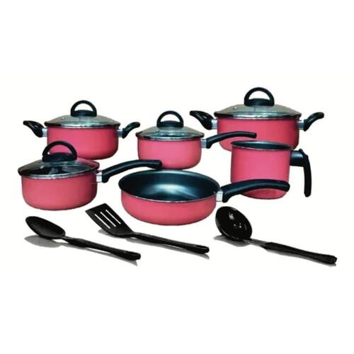Jogo de panelas 09 peças rosa antiaderente com tampa de vidro + utensílios Composição: Panela 16 Panela 18 Caçarola 18 Caçarola 20 Canecão 14 Frigideira 20 s/ tampa 3 utensílios diversos Marca: marpal Material: alumínio; teflon antiaderente Material das tampas: vidro temperado Material dos utensílios: nylon Material alças e poméis: baquelite Espessura: 1,0 mm Cor: rosa Imagens meramente ilustrativas. As tonalidades podem variar de acordo com seu monitor ou até mesmo com a percepção dos seus olhos O fabricante pode alterar detalhes de cor nos produtos sem aviso prévio