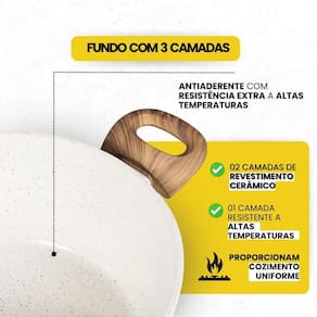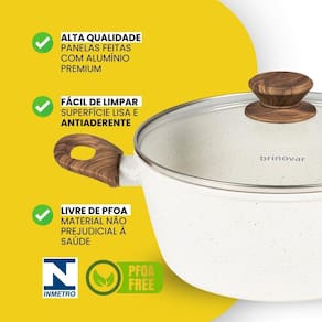 O Jogo de Panelas Brinovar Vanilla 7 Peças + 3 Utensílios combina design moderno, praticidade e resistência. Feitas em alumínio com revestimento cerâmico tripla camada, oferecem cozimento uniforme, alimentos sem grudar e limpeza rápida. Compatíveis com todos os fogões gás, elétrico, vitrocerâmico e indução , contam com tampas de vidro temperado e cabos antitérmicos para mais segurança. Saudáveis e livres de PFOA, preservam o sabor natural dos alimentos. Especificações Técnicas Material: Alumínio com revestimento cerâmico tripla camada antiaderente . Tampas: Vidro temperado com saída de vapor. Cabos, Alças e Pegadores: Baquelite antitérmico com revestimento soft touch Acessórios: 3 Colheres de pau de bambu Cor: Vanilla bege claro elegante . Compatibilidade: Fogões a gás, elétrico, vitrocerâmico e indução. Segurança: Livre de PFOA. : 90 dias Conteúdo da embalagem: 01 Panela: Capacidade: 1,3 Litros Diâmetro: 16 cm Altura: 8,5 cm 01 Panela: Capacidade: 2,25 Litros Diâmetro: 20 cm Altura: 9 cm 01 Caçarola: Capacidade: 2,25 Litros Diâmetro: 20 cm Altura: 9 cm 01 Caçarola: Capacidade: 3,8 Litros Diâmetro: 24 cm Altura: 10,5 cm 01 Frigideira: Capacidade: 0,75 Litros Diâmetro: 18 cm Altura: 4,3 cm 01 Frigideira: Capacidade: 1,6 Litros Diâmetro: 24 cm Altura: 4,9 cm 01 Leiteira: Capacidade útil: 1,5 Litros Diâmetro: 14 cm Altura: 10 cm 03 Colheres de Pau de Bambu: Tamanho: 6,5 30 cm Instruções de uso e conservação: Antes do primeiro uso, lave com esponja macia, enxágue e seque bem. Depois da primeira lavagem, faça a cura: unte a parte interna com óleo, aqueça em fogo baixo, deixe esfriar, descarte o conteúdo e lave novamente.