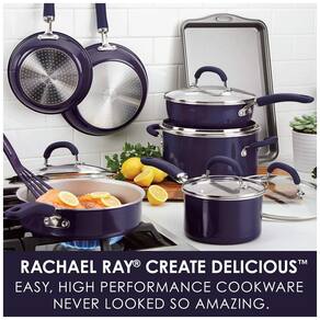 O CONJUNTO DE COZINHAS ANTIADERENTE INCLUI: Panela de 1,5 litros com tampa, Panela de 3 L com tampa, Panela de 6 L com tampa, Frigideira funda de 21,6 centímetros, Frigideira profunda de 26 centímetros, Panela refogada de 3 L com tampa, Espátula de 24,5 centímetros, forma de biscoitos de 23 x 33 centimetros.