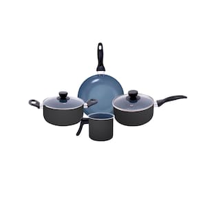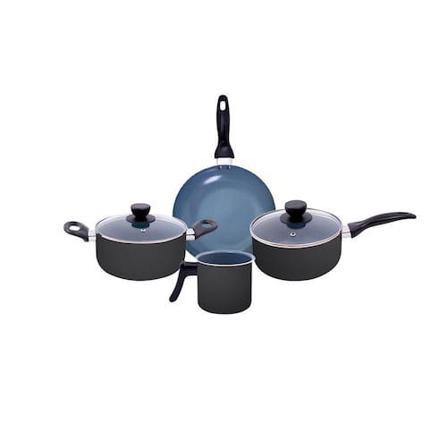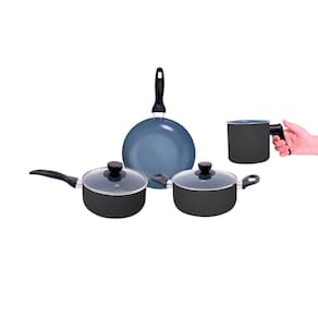 a panela e a caçarola são de alumínio, cerâmica, aço inox, vidro temperado e baquelite. a frigideira e a leiteira são de alumínio, cerâmica e baquelite.