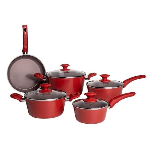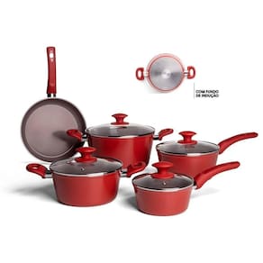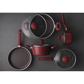 Material: Alumínio Cor predominante: Vermelho Linha: Optima Espessura: 4,5mm Dimensões: Caçarola 24 x 13cm Caçarola 20 x 9,5cm Panela 20x9,5cm Panela 16x7,5cm Frigideira 24x5cm Pode ir em fogões à gás, elétrico, vitrocerâmico e de indução. Não vai à lava-louça, forno e micro-ondas.