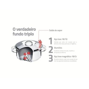 Trazem ainda a tecnologia de fundo triplo (aço inox + alumínio + aço inox), que distribui o calor uniformemente, proporcionando um cozimento mais rápido e uniforme, economizando energia e deixando os alimentos aquecidos por mais tempo.