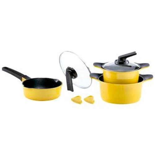 Composição do jogo 01 Caçarola nr. 20 de 2,6 litros 01 Caçarola nr. 24 de 4,6 litros 01 Panela multifuncional nr. 20 de 2,6 litros 01 Tampa Standing nr. 20 01 Tampa Standing nr. 24