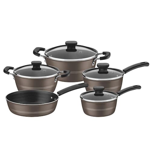 Jogo De Panelas 5pçs Sicília Tramontina 20499615 O jogo de panelas Tramontina Sicília em alumínio com revestimento interno e externo antiaderente Starflon Excellent avelã 5 peças vai garantir uma cozinha equipada com utensílios de alta qualidade e eficiência Suas peças são produzidas em alumínio com revestimento interno e externo de antiaderente Starflon Excellent, características que proporcionam o cozimento uniforme dos alimentos, evita que eles grudem em sua superfície e as torna mais duráveis. Suas panelas e caçarolas vem com tampa de vidro temperado com saída de vapor e borda de aço inox e seus cabos, alças e pegadores são em material antitérmico e garantem um manuseio muito mais confortável e seguro. Elas ainda são fáceis de limpar e podem ir à máquina de lavar louças, otimizando sua rotina na cozinha CONTÉM IMAGENS ILUSTRATIVAS