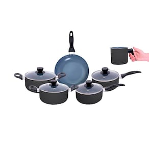 as panelas e caçarolas são de alumínio, cerâmica, aço inox, vidro temperado e baquelite. a frigideira e a leiteira são de alumínio, cerâmica e baquelite.