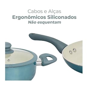 - Alumínio com revestimento cerâmico - Tampas de vidro temperado com bordas em silicone - Cabos e alças siliconadas - Cor: Parte externa azul metalizado e parte interna creme - Espessura 2,5mm