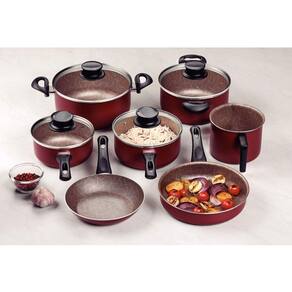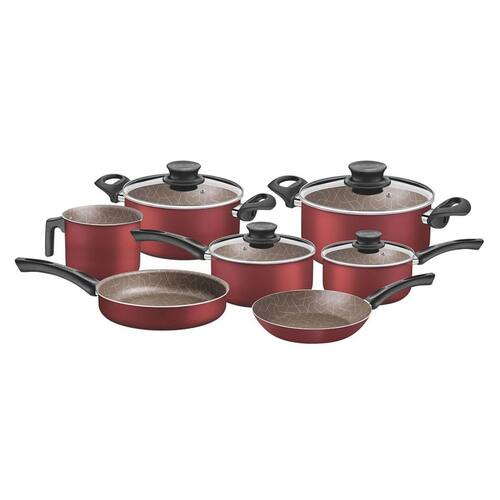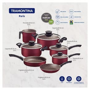 Jogo De Panelas 7 Ppçs Paris Vermelho Tramontina 28599702 O jogo de panelas Tramontina Paris em alumínio com revestimento interno e externo antiaderente Starflon Max vermelho 7 Peças tem itens especiais para o sucesso das suas tarefas na cozinha Ele tem peças produzidas em alumínio com revestimento interno e externo antiaderente Starflon Max, atributos que proporcionam o cozimento uniforme dos alimentos e evita que eles grudem em suas superfícies. Suas panelas e a caçarola possuem tampas de vidro temperado com bordas em aço inox e seus cabos e alças são em baquelite antitérmico e os pegadores em nylon, materiais que proporcionam um manuseio seguro e confortável, pois não aquecem. Além disso, é um jogo fácil de limpar e que pode ir à máquina de lavar louças. Com a Tramontina, você tem o melhor para equipar sua cozinha