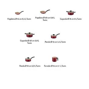 Jogo de Panelas 7Pçs Turim Verm Antiaderente Tramontina Leve o jogo de panelas Tramontina Turim em alumínio com revestimento interno e externo em antiaderente Starflon Max vermelho 7 peças para o seu dia a dia e garanta maior praticidade para o preparo das suas refeições. Produzido em alumínio com revestimento interno e externo em antiaderente Starflon Max, as peças garantem o cozimento rápido e uniforme dos alimentos, evitam que eles grudem em sua superfície, são muito fáceis de limpar e mais duráveis. Os cabos e alças são em material antitérmico e não aquecem, o que garante um manuseio muito mais seguro e confortável. Um jogo prático, que pode ir à máquina de lavar louças e que acompanha tampas de vidro temperado com bordas de aço inox que facilitam o preparo das suas receitas Conteúdo: 1- Frigideira16cm -0,4L 1- Frigideira 20cm -0,8L 1- Caçarola 18cm -2L 1- Caçarola 20cm -2,8L 1- Panela 16cm -1,4L 1- Panela 18cm -2L 1 -Fervedor 12cm -1,1L Jogo Contém: 7 Peças Marca: Não Informado