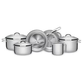 Jogo de Panelas Aço Inox 6 Pçs Solar Tramontina Práticas e duráveis, as seis peças são produzidas totalmente em aço inox, que mantém os alimentos saudáveis já que o material não solta resíduos. Possuem fundo triplo aço inox + alumínio + aço inox , característica que distribui o calor de forma uniforme, proporcionando um cozimento mais rápido e deixando os alimentos aquecidos por mais tempo, além de economizar mais energia. São peças versáteis que podem ir ao forno para gratinar ou finalizar pratos na temperatura máxima de 260C e ser utilizadas em diferentes tipos de fogões. O fervedor não é indicado para o fogão à indução. Possuem tampa com encaixe perfeito e saída de vapor. São ainda muito estilosas. O acabamento em alto brilho faz delas as melhores escolhas para uma cozinha mais bonita. São fáceis de limpar devido ao desenho sem cantos, além de poderem ir à máquina de lavar louças diariamente. Especificações: Marca: Tramontina Modelo: Jogo de panelas 6 peças Linha: Solar Quantidade de Peças: 06 Material: Aço Inox Conteúdo: 1- Panela 16cm -1,4L 1- Frigideira 20cm 2,2L 1- Cozi-Vapore 20cm 3,6L 1- Caçarola Funda 20cm 3,6L 1- Caçarola Rasa 24cm 4,7 L 1- Fervedor 12cm 1,4L : 3 meses 7891116061589