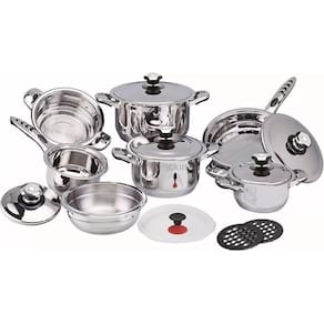 Com capacidade e dimensões variadas, o conjunto inclui uma caçarola de 6,5 litros 24cmX14cm , uma caçarola de 3,0 litros 20cmX10cm , uma caçarola de 1,6 litros 16cmX8cm , uma frigideira de 3,05 litros 24cmX6,5cm , uma panela de 1,6 litros 16cmX9cm , uma panela vaporizadora 20cmX10cm , uma fritadeira 18cm , uma bacia para misturas 20cmX6cm com tampa plástica, dois suportes de panelas em bakelite, um conjunto de utensílios de cozinha com 6 peças em nylon, e um botão de sucção. Além disso, o jogo acompanha um livro de receitas escrito em 3 línguas Alemão, Inglês e Russo e um Cartão de Certificação da fábrica.