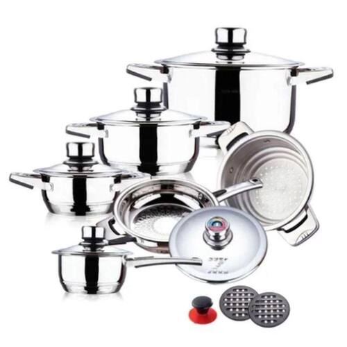 Jogo de Panelas Alemã 23 peças Luxo Jogo com 23 peças. Fabricação alemã com certificado de garantia mundial. As peças são em aço cirúrgico com tampa de vidro temperado, fundo em 9 camadas com revestimento cerâmico e antiaderente. Todas as tampas são equipadas com termômetro / termostato. Aço inoxidável 18/10. Relação das peças: 1 Caçarola 6,5 litros medindo 24cmX14cm com tampa de vidro temperado 1 Caçarola 3,0 litros medindo 20cmX10cm com tampa de vidro temperado 1 Caçarola 1,6 litros medindo 16cmX8cm com tampa de vidro temperado 1 Frigideira 3,05 litros medindo 24cmX6,5cm com tampa de vidro temperado 1 Panela 1,6 litros medindo 16cmX9cm com tampa de vidro temperado 1 Panela vaporizadora medindo 20cmX10cm sem tampa 1 Fritadeira medindo 18cm 1 Bacia para misturas medindo 20cmX6cm com tampa plástica 2 Suporte de panelas em bakelite 1 Conjunto de utensílios de cozinha com 6 peças em nylon 1 Botão de sucção Acompanha ainda um livro de receitas escrito em 3 línguas Alemão, Inglês e Russo , além de um Cartão de Certificação da fábrica. Peso aproximado do conjunto é de 11,5Kgs. Marca: Nakasaki