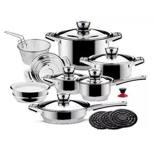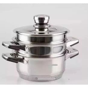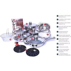 Jogo De Panelas Alemão Aço Cirúrgico 23 Peças - Top De Linha Jogo com 23 peças. Fabricação alemã com certificado de garantia mundial.As peças são em aço cirúrgico com tampa de vidro temperado, fundo em 9 camadas com revestimento cerâmico e antiaderente.Todas as tampas são equipadas com termômetro / termostato.Aço inoxidável 18/10. Relação das peças: 1 Caçarola 6,5 litros medindo 24cmX14cm com tampa de vidro temperado 1 Caçarola 3,0 litros medindo 20cmX10cm com tampa de vidro temperado 1 Caçarola 1,6 litros medindo 16cmX8cm com tampa de vidro temperado 1 Frigideira 3,05 litros medindo 24cmX6,5cm com tampa de vidro temperado 1 Panela 1,6 litros medindo 16cmX9cm com tampa de vidro temperado 1 Panela vaporizadora medindo 20cmX10cm sem tampa 1 Fritadeira medindo 18cm 1 Bacia para misturas medindo 20cmX6cm com tampa plástica 2 Suporte de panelas em bakelite 1 Conjunto de utensílios de cozinha com 6 peças em nylon 1 Botão de sucção Acompanha ainda um livro de receitas escrito em 3 línguas Alemão, Inglês e Russo , além de um Cartão de Certificação da fábrica. Peso aproximado do conjunto é de 11,5Kgs.