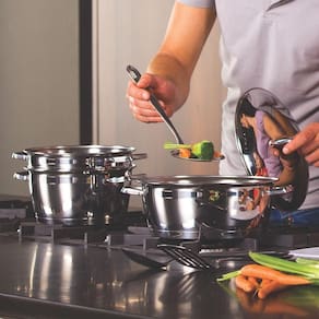 - Economiza tempo e energia: o segredo está no fundo triplo (aço inox + alumínio + aço inox), que distribui o calor uniformemente, proporcionando um cozimento mais rápido. Por isso, você pode manter o fogo baixo durante todo o preparo e, assim, poupar energia. Além disso, a panela toda em aço inox pode ir ao forno para gratinar ou finalizar pratos, na temperatura máxima de 260C.