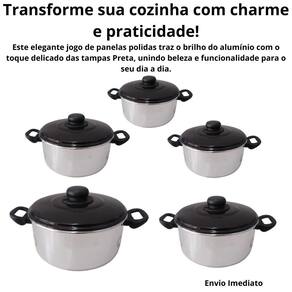 Jogo De Panelas Alumínio Caçarola tampas Preta 5 peças jogo de Panelas Polidas com Tampas Preta - 5 Peças Nº 22, 20, 18, 16 e 14 Transforme sua cozinha com charme e praticidade Este elegante jogo de panelas polidas traz o brilho do alumínio com o toque delicado das tampas Preta, unindo beleza e funcionalidade para o seu dia a dia. Características: