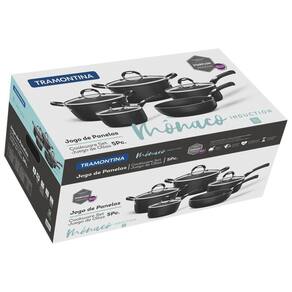 Com o Jogo de Panelas Tramontina Mônaco Induction em Alumínio com Revestimento Interno e Externo Antiaderente Starflon Premium Preto 5 Peças você tem as peças essenciais para o sucesso das suas receitas Suas peças tem corpo produzido em alumínio com espessura de 3 milímetros que proporciona o cozimento rápido e uniforme os alimentos. Seu revestimento interno e externo é antiaderente Starflon Premium, que não gruda, é fácil de limpar, mais durável e não é prejudicial a sua saúde e da sua família. Suas caçarolas e panelas acompanham tampa de vidro temperado com borda de aço inox e saída de vapor que auxilia no preparo dos alimentos e facilita a visualização. Seus cabos, alças e pegadores metálicos contam com proteção de silicone que reduz a propagação de calor, garantindo um manuseio muito mais seguro e confortável. Elas são fáceis limpar e podem ir à máquina de lavar louças, facilitando seu dia a dia. O melhor para sua casa você só encontra com a Tramontina