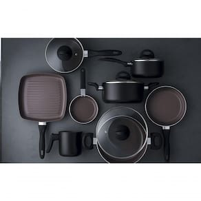 Composição - 01 Panela com Tampa Diâmetro: 16 cm | Altura: 8 cm | Capacidade: 1,25 L01 Panela com Tampa - Diâmetro: 18 cm | Altura: 9 cm | Capacidade: 1,55 L01 Caçarola com Tampa Diâmetro: 20 cm | Altura: 9,5 cm | Capacidade: 2,55 L01 Caçarola com Tampa Diâmetro: 24cm | Altura: 11,5 cm | Capacidade: 4,55 L01 Frigideira Diâmetro: 14cm | Altura: 2,5 cm | Capacidade: 0,2 L01 Frigideira Diâmetro: 20cm | Altura: 3,5 cm | Capacidade: 0,6 L01 Grill Diâmetro: 24cm | Altura: 3 cm | Capacidade: 1,35 L01 Fervedor Diâmetro: 11cm | Altura: 12,5 cm | Capacidade: 1 L