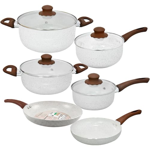 É composto por duas caçarolas, duas panelas com cabo e duas frigideiras, todos em alumínio com revestimento cerâmico na cor vanilla e granilites marrons.