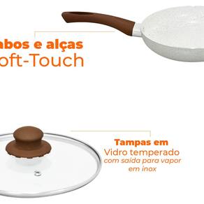 As peças do conjunto possuem cabos e alças com acabamento siliconado Soft-Touch na cor marrom, que dão um toque macio e não esquentam, evitando acidentes.