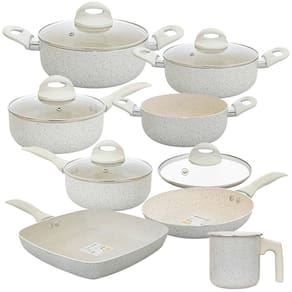 O Conjunto Casambiente 8 peças é indicado para fogões a gás, vitrocerâmico ou elétrico, é composto por duas caçarolas, duas panelas com cabo, uma frigideira, uma frigideira para ovo, uma bistequeira e uma leiteira, todos em alumínio na cor vanilla com revestimento cerâmico preto marble.