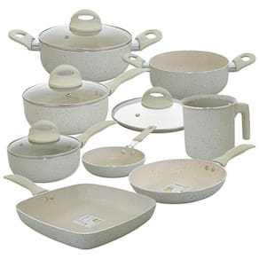 O Conjunto Casambiente 8 peças é indicado para fogões a gás, vitrocerâmico ou elétrico, é composto por duas caçarolas, duas panelas com cabo, uma frigideira, uma frigideira para ovo, uma bistequeira e uma leiteira, todos em alumínio na cor vanilla com revestimento cerâmico preto marble.