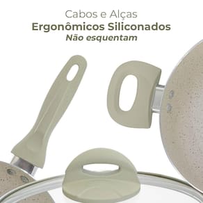 As peças do conjunto possuem cabos e alças com acabamento siliconado Soft-Touch da mesma cor da panela, que dão um toque macio e não esquentam, evitando acidentes.