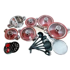 Com capacidade de 5 litros e medindo 24cmx14cm com tampa, esse jogo conta com uma variedade de peças que vão facilitar o preparo das suas refeições. São elas: 1 caçarola de 3.0 litros medindo 20cmx10cm com tampa, 1 caçarola de 1.6 litros medindo 16cmx08cm com tampa, 1 frigideira de 3.0 litros medindo 24cmx6.5cm com tampa, 1 panela de 1.6 litros medindo 16cmx09cm com tampa, 1 panela vaporizadora medindo 20cmx10cm, 1 fritadeira medindo 18cm, além de 11 utensílios para cozinha.