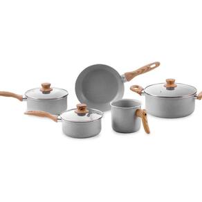 RESUMO: Jogo de Panelas 5 Peças Linha Ceramic Life Easy/Brinox; ---Tampas em vidro temperado com saída de vapor; -Antiaderente Pro-Ceramic; -Tecnologia Mineral Resist; -Pintura Siliconada; -Cor Gris com grânulos Brancos; -Caçarola com Tampa Ø 22 x 10 cm - 3,5 L; -Panela com Tampa Ø 18 x 8,5 cm - 1,9 L; -Panela com Tampa Ø 16 x 7,5 cm - 1,3 L; -Frigideira Ø 22 x 4,3 cm - 1,1 L; -Fervedor Ø 12 x 11,8 cm; Cabos, alças e poméis são em baquelite, acabamento soft-touch e efeito amadeirado.