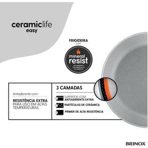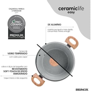 ANTIADERENTE PRO-CERAMIC: o revestimento interno das Panelas Easy/Brinox é fabricado com três camadas do antiaderente Pro-Ceramic, que contém partículas de cerâmica em sua composição e que confere resistência extra aos itens, além de reduzir a necessidade de óleos e facilitar a limpeza. Já a tecnologia Mineral Resist aumenta a resistência a altas temperaturas. São itens livres de metais pesados e elementos prejudiciais à saúde (PFOA free), com classificação de antiaderência A(ótima) no Inmetro.