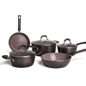 Conjunto de 5 peças compatível com todos os tipos de cooktops, incluindo indução, proporcionando aquecimento uniforme e fácil limpeza para o dia a dia na cozinha.