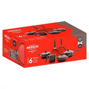 Conjunto de Panelas Brinox Ceramic Life Easy 6 Peças VermelhoCom o Conjunto de Panelas Ceramic Life Easy em Alumínio 6 Peças da Brinox, cozinhe com ainda mais eficiência graças ao seu revestimento interno cerâmico Pro Ceramic Premium e Mineral Resist que exigem menos óleo no preparo proporcionando uma refeição sempre mais saudável. Fabricada em alumínio, que dissipa melhor o calor e cozinha por igual e mais rápido, tampas de vidro temperado, com saída para vapor. Agregando modernidade e velocidade no cozimento, possui revestimento interno em antiaderente pro-flon, que impede que os alimentos grudem, mesmo com uso reduzido de óleo o que torna a limpeza mais fácil. Os cabos e alças de baquelite que não esquentam, tornando o manuseio dos utensílios mais fácil e seguro. As caçarolas e panelas ainda possuem tampa de vidro temperado, permitem que enquanto você cozinha possa visualizar seus alimentos durante o preparo, além da saída de vapor. Conteúdo do jogo:1 - Panela com tampa 16cm x 8,2cm 1,4 litros1 - Panela com tampa 18cm x 9,2cm 2,1 litros1 - Caçarola com tampa 20cm x 9,5cm 2,55 litros1 - Tapioqueira 22cm x 2cm 0,5 litros1 - Frigideira 20cm x 3,4cm 0,6 litros1 - Fervedor 12cm x 11,8cm 1,25 litrosCaracterísticas:Marca: BrinoxLinha: Ceramic Life EasyCor: Preto VermelhoRef: 4789/113Material: AlumínioRevestimento: Cerâmico AntiaderentePeso: 4,2 kgDimensões da embalagem: 19cm A x 28cm L x 49cm C Observação: Objetos decorativos que aparecem nas imagens não acompanham o produto. Imagens meramente ilustrativas.