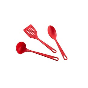 Para cozinheiros de primeira viagem, novos casais ou até para renovar os itens básicos da cozinha, o conjunto de panelas de alumínio da linha Chilli é ideal, afinal ele é super completo. O revestimento interno antiaderente não deixa o alimento grudar, mesmo com uso reduzido de óleo no preparo de alimentos, o material também facilita a limpeza. O alumínio da estrutura dissipa melhor o calor cozinhando o alimento mais rápido e por igual. Os cabos são de baquelite, material que não aquece, tornando o manuseio dos utensílios mais seguro. O conjunto de panelas está disponível na cor cereja e possui tampas de vidro com saída para o vapor. Além disso, acompanha conjunto de utensílios: a colher, para preparar e servir alimentos do dia-a-dia como arroz e outras porções, a concha terrina, para molhos, sopas e caldos, e a espátula, ideal para alimentos como omeletes e hambúrguers. As três peças do conjunto são de nylon, ou seja, resistem a temperaturas de até 180ºC e são ideais para utilizar em panelas com revestimento antiaderente, pois não danificam o fundo.
