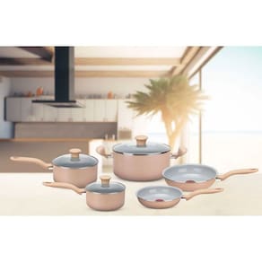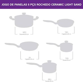 Características: Marca: Rochedo Modelo: Ceramic Light Sand Material: Alumínio com revestimento interno cerâmico Linha: Light Sand Quantidade de peças: 5 Peças Código da Certificação INMETRO: Frigideira 008546/2023 Panela e caçarola - 008547/2024